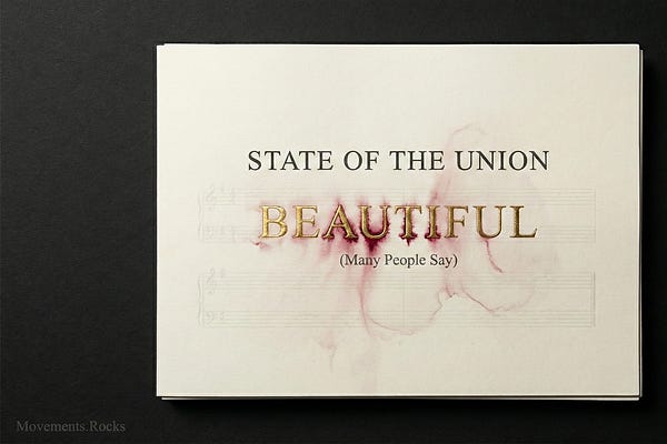 “The State of the Union Is Beautiful (Many People Say)” is a baroque satire about spectacle, grift, and the orchestra that keeps playing while the roof…